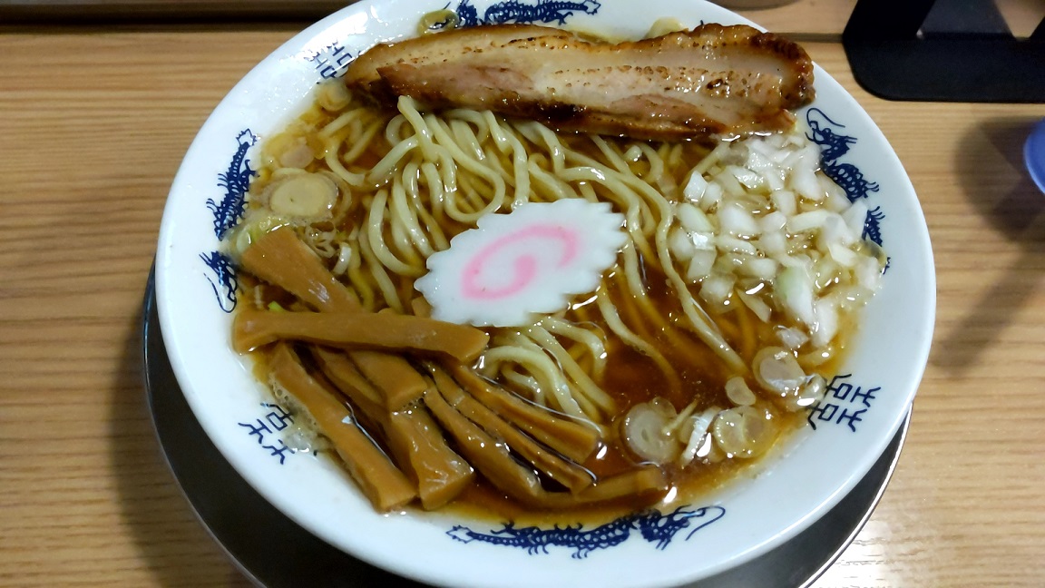 中央にナルト、端にメンマ、刻んだタマネギと炙り豚。新しさとレトロ感の融合。紅しょうが天そば 430円
